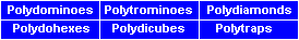 Polydiamonds are sets formed from the joining of diamonds (two joined equilateral triangles). The n-diamonds are subsets of the 2n-iamonds. For constructions with these see Miroslav Vicher's site.