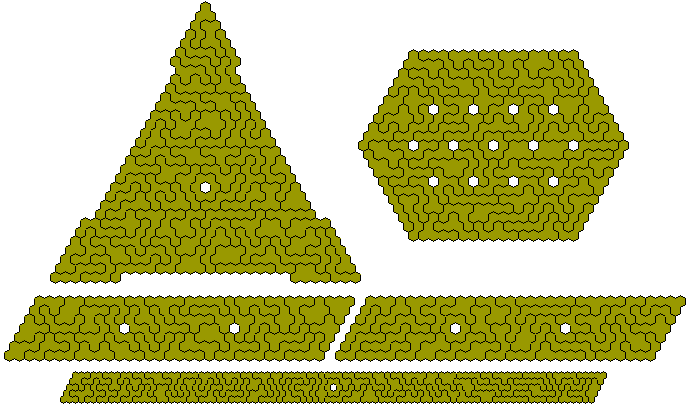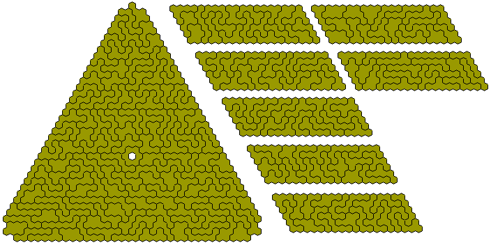 There are 134 one-sided tridohexes including one with a hole. The pieces without a hole can form seven 6x19 parallelograms.