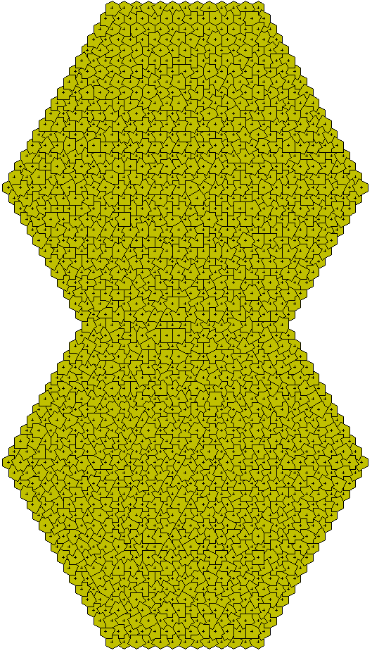 For this puzzle we have a hexagon with edges - neuter, +/- a drafter - giving 1355 pieces. Solution of 1355 pieces by Mark Stubbings inAug 2001.