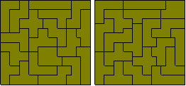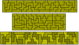 The 35 one-sided pieces shown below can also form rectangles. At least some of 2½ x 63, 3½ x 45, 4½ x 35, 5 x 31½, 7 x 22½, 7½ x 21, 9 x 17½ and 10½ x 15 are possible (the first two are not possible). The first two solutions are by Peter Esser and the three colour version of the 5 x 31½ is by Patrick Hamlyn. Peter Esser has a page on his website devoted to the one-sided truncated pentominoes.