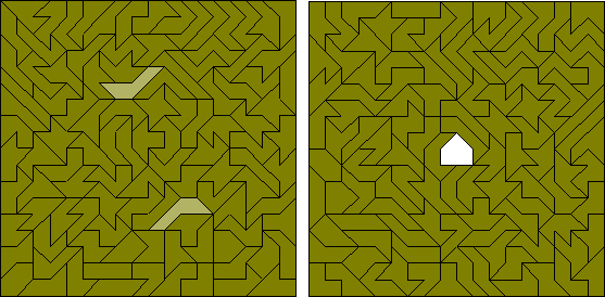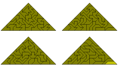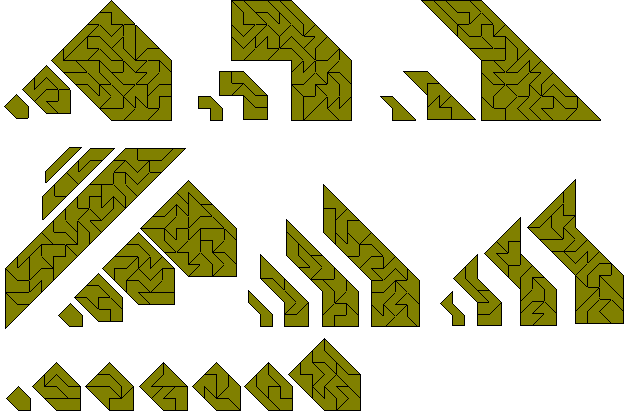 Although the 107 pieces cannot make any rectangle it should be possible to make one-, five- and nine-fold copies of some of the pieces. The pieces to be made must odd numbers of sloping edges in both directions as in the diagrams below by Peter Esser. As Peter points out not only must there be an odd number of sloping edges but also 1-5-9-replicas are possible only for the balanced pieces because there is an odd number of balanced pieces which gives an odd number of black triangles under checkerboard colouring for the whole construction.