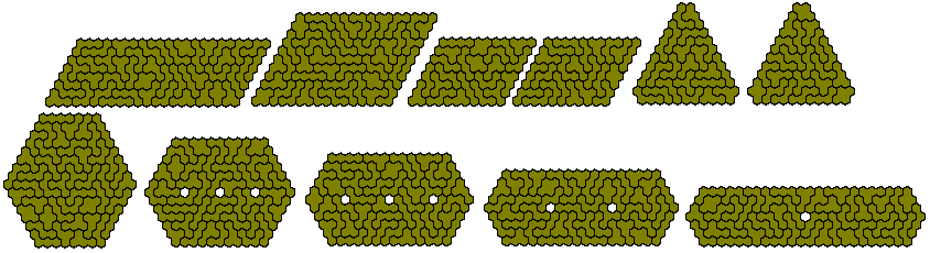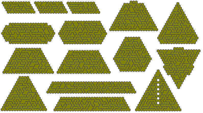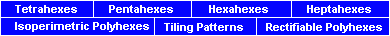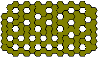 There are three regular polygons which tile the plane- square, equilateral triangle and regular hexagon. Thus in the same way as a square grid gives us polyominoes and an isometric grid polyiamonds we obtain polyhexes from an hexagonal (honeycomb) grid. Such a grid is shown below with five examples of polyhexes.