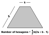 A number of the figures above are in the shape of a trapezium. An a-b trapezium as shown below will contain ½b(2a+b-1) hexagons.