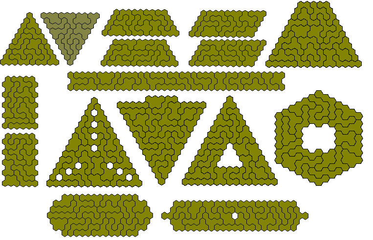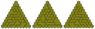 There are 33 one-sided pentahexes shown here in three triangles with the central triangle formed from the symmetric pieces and the other two triangles being reflections of each another..
