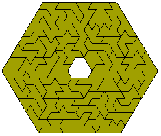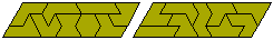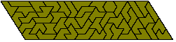 If we consider mirror image pairs as distinct then there are 19 hexiamonds. The full set cannot form any trapezium or parallelogram although 18 of the pieces can form a 3x18 parallelogram in 1440 ways. The solution below is in the form of two 3x9 parallelograms and all solutions decompose into two parallelograms. The number of solutions for the various decompositions is 4-14 (16); 5-13 (212); 6-12 (332); 7-11 (356); 8-10 (324) and 9-9 (200). Notice that one of the two snakes is absent from the solution below - this piece is absent from all 1440 solutions.
