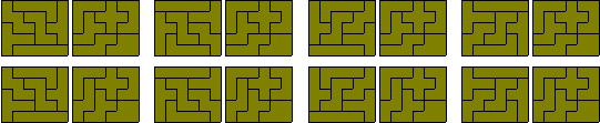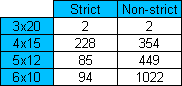 Patrick Hamlyn has analysed the solutions of the various rectangles to determine which can be coloured with only three colours. He has found the following information on numbers of rectangles which can be three coloured. Strict colouring demands that no two identically coloured pieces touch even at a corner whereas non-strict colouring allows corner touching. No solution can be two coloured.