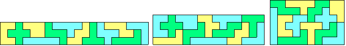 Three of the rectangles above can be coloured with three colours two with strict colouring - click here to see the image. As you can see from the numbers three coloured solutions can be quite rare with only 4% of the 6x10 rectangles having a strict three colouring. None of the rectangles will allow a two coloured solution. For the 4x15 rectangle there are just five essentially different ways to make a 4x5 and a 4x10 rectangle with the set. All these solutions can be three coloured.