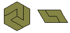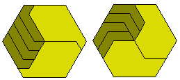 The two octiamonds in the hexagon of side 4 are simple examples of general polyiamonds which form hexagons. The diagrams above can be simplified as below.