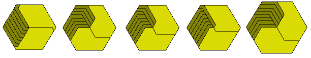 In the above figure the hexagon is divided into six congruent regions one of which if filled with the pentiamond. Unlike rectangles, triangles, parallelograms and rhombi, a number of hexagons cannot combine to make a larger one and so the concept of 'prime' hexagon has no meaning. Thus in order to investigate all possible hexagons we need to find a diagram such the one below. In this the central hexagonal area is filled as above and then pentiamonds are used to create rings around it to make hexagons of side 10, 15, 20 etc.