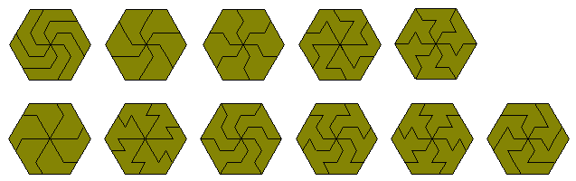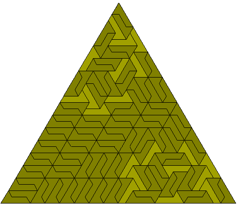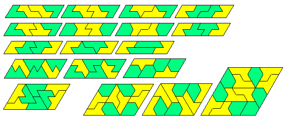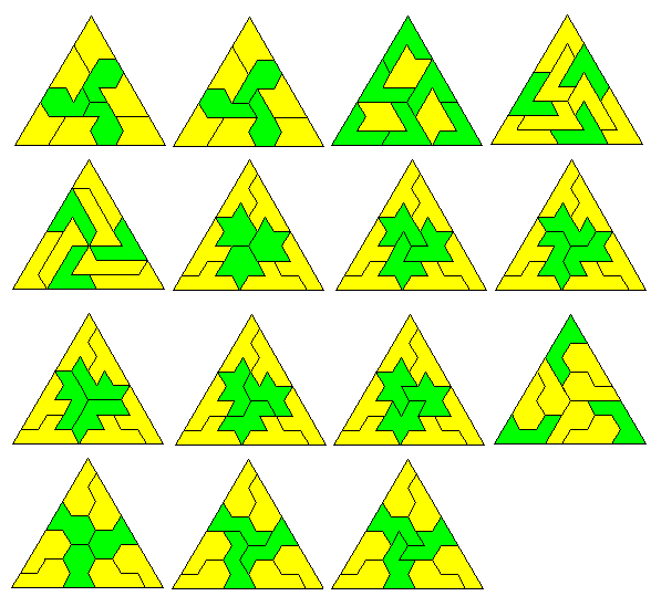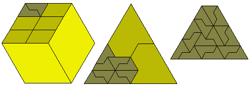 Each sphinx has an excess of 2 and since there must be 6 pieces in any solution the excess must be a multiple of 4 which shows that the construction is impossible. This argument applies equally to any triangle of side 12k+6 and so only triangle of side 12k are possible. These can, of course, be made from the side 12 triangle shown above.All of the pieces forming parallelograms above can, of course, also form hexagons but in addition both the shoe and the club can form hexagons. In the case of the club four pieces make a hexagon of side 2 and for the shoe 9 are required to hexagon of side 3 thus making the shoe have an odd H-order.