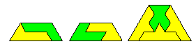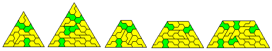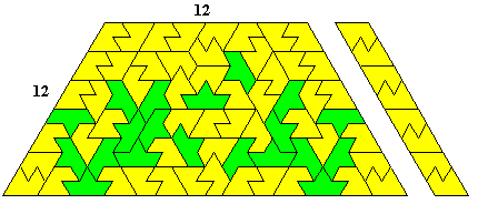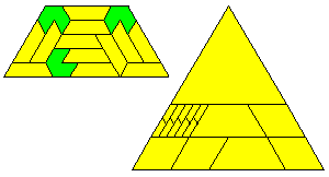 The above shows triangle made with 3 and 4; 1 and 4; 1 and 3; 1 and 2; and 2 and 4. Pieces 2 and 3 definitely do not form a triangle. Mike Reid conjectures that the 15 edge triangle with 1 and 3 is the smallest possible. The figure below shows a trapezium made up of these pieces which would provide another solution to the triangle but also can be used to extend the triangle to form any triangle of side 15n+5.