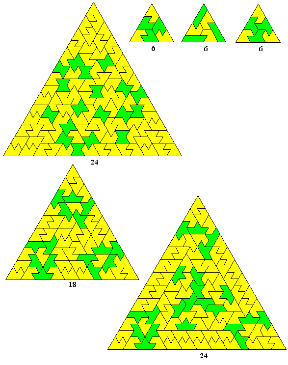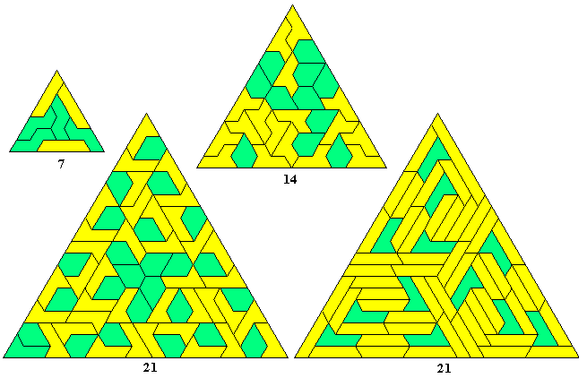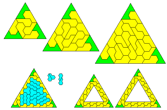 Another way in which multiple triangles may be formed is shown below where we see triangles of sides 9, 12 and 15 and another pattern (a triangle of side 21) where the centre of the figure is made up of trihexes which in turn are produced by pairs of an enneiamond. This type of construction can almost certainly be expanded to form any triangle of side 3n where n>2. Another method of forming these larger triangles is shown at the bottom right where borders are formed around existing triangles to form larger ones (these constructions are by Mike Reid).
