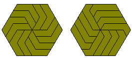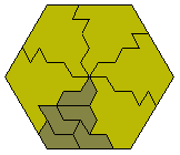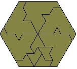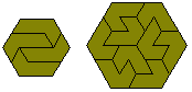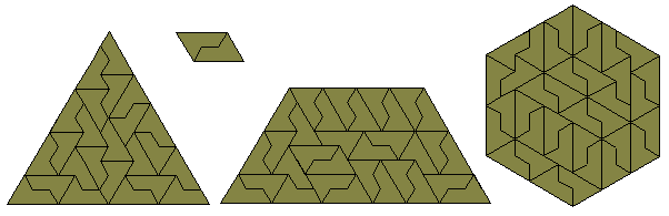 The triangle, parallelogram, and hexagon formed are the smallest possible with this polyiamond. Any polyiamond which forms a parallelogram can also form a hexagon. An example of this is shown below where 6 copies the hexiamond parallelogram above are joined to make a rhombus and then the three rhombi are joined to make a hexagon of side 6 (this is a simpler version of the one in the diagram above).