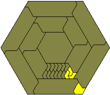 Notice also that two copies of the trapezium above can be joined to give a hexagon of side 8. This trapezium is not the smallest possible as shown in the diagram above sent to me by Mike Reid. The diagram at the centre (also due to Mike Reid) shows a simpler version of the triangle where 8 hexiamonds form one third of the full triangle.