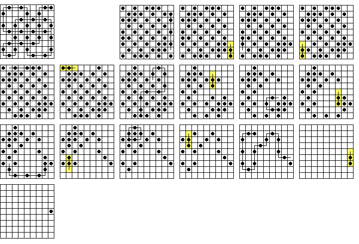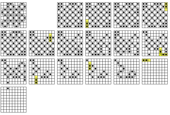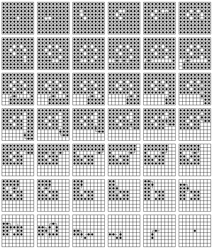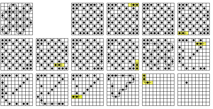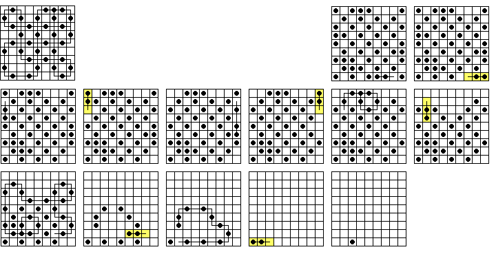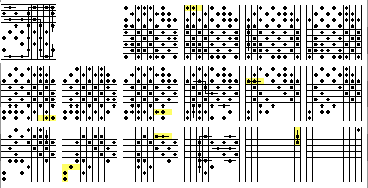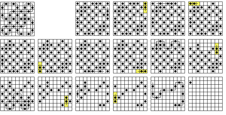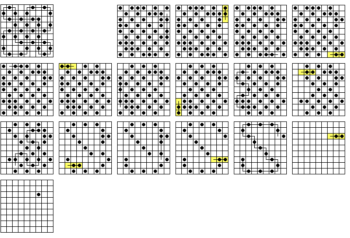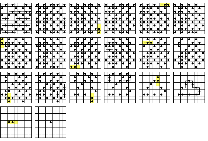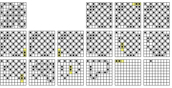 Note: The solution diagrams show how to play from the complement of the sweep positions to one peg. The solution ending with the long sweep can then be obtained by executing the jumps in exactly the reverse order, starting from a board position with one vacancy at the location of the finishing peg. In the diagrams, jumps that capture "white pegs" (see below) are colored in yellow. |