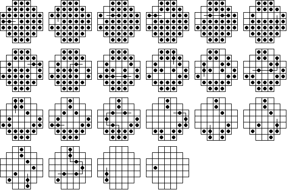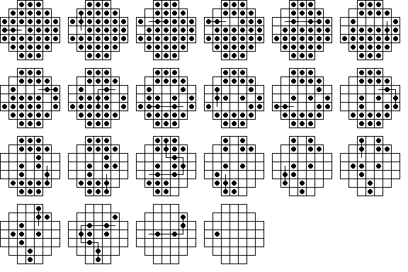 23 moves are required to reach these positions from the central vacancy. The positions with 9 pegs (the right three) can only be reached by using single jump moves. The rightmost board is also the only one (of 15 total) that can appear in a solution to the central game. | |||||||||||||||||||||||||||||||||||||||||||||||||||||||||||||||||||||||||||||||||||||||||||||||||||||||||||||||||||||||||||||||||||||||||||||||||||||||||||||||||||||||||||||||||||||||||||||||||||||||||||||||||||||||||||||||||||||||||||||||||||||||||||||||||||||||||||||||||||||||||||||||||||||||||||||||||||||||||||||||||||||||||||||||||||||||||||||||||||||||||||||||||||||||||||||||||||||||||||||||||||||||||