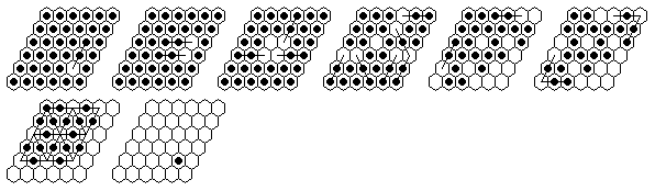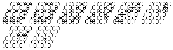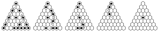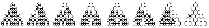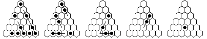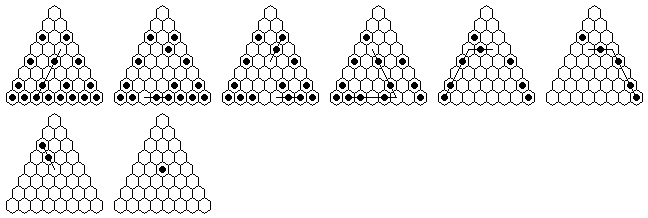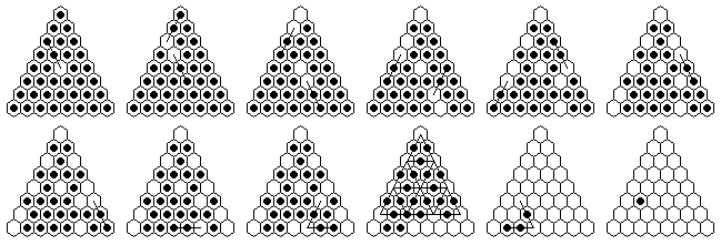 Note that many solutions are possible, and you do not have to execute the moves in the order shown in the diagrams. The solutions shown are optimized, it is more natural to make many jumps in one section of the board before moving on to another section. The forward solutions are also optimized, and do not use the exact same jump sequence reversed. Often, by reordering the jumps, you can get a shorter solution than you get from a reversal.
