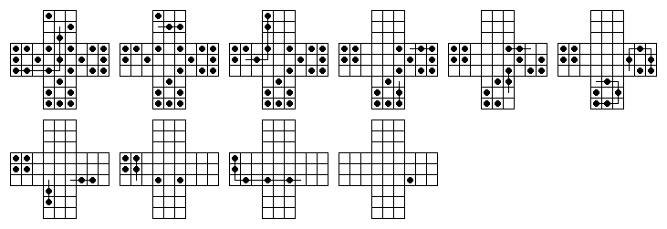 For the central game on the 45-hole Wiegleb's Board, the following table shows the size of the sets Bn and B-n. The 8-fold symmetry of the problem was taken into account, plus the resource count at the top of this page. For the forward problem, we can ignore any board position where this resource count evaluates to less than 0 (this has no effect until n=7). For the backward problem, we can ignore any board position where this resource count evaluates to more than 4 (this has no effect until n=2). Without this resource count the board counts at the final level would be approximately twice as large.