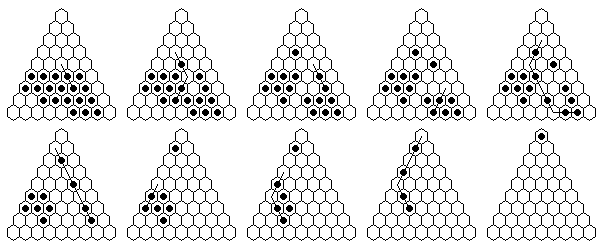 W6. | Stephen Hartke has studied the problem in reverse, i.e. starting with one man and moving him down to form an army. In this paper he and Pieter Blue consider the puzzle where an infinite number of jumps are allowed. | |