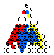 The table below shows minimal armies divided into "regiments". For example, all the red men form a regiment which is capable of reaching the top hole colored red. The red and blue men are usually mirror images of one another. The final hole to be reached is marked by an X. Sometimes it is the case that one regiment must move before the others. Note that the army diagrams presented above do not necessarily proceed forward by regiment. In general, there are many ways that a specific army can move forward to reach its final target hole.