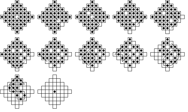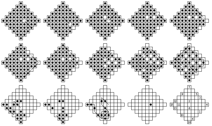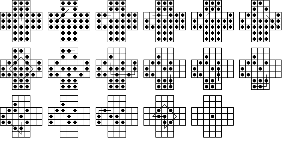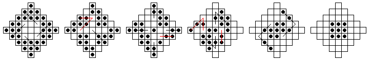 33-Hole Board (Standard) | 8-Move | 15 | 4 | 5 | 33-hole board with moves along both diagonals. Computational result. I have been able to prove that this problem cannot be solved in less than 14 moves. |