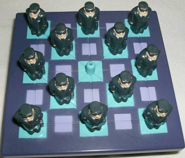 If you rotate this board 45 degrees, it is easy to see that it is a 13 hole Diamond Board, or draughtsboard created from a 5x5 square board, with the addition of diagonal moves along both diagonals. Without the addition of diagonal moves, no single vacancy to single survivor problem on this board is solvable. However with the diagonal jumps many problems become solvable, and its small size makes solutions easier to work out. An interesting advanced problem is to try to solve the central game on this board in as few as 7 moves (recall that a move is one or more consecutive jumps by the same frog!).