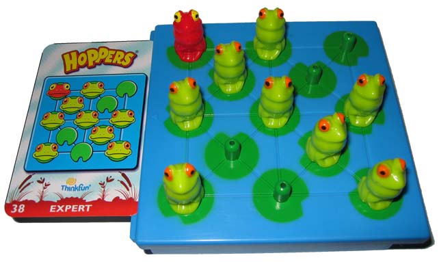In the diagrams below the board is rotated by 45 degrees, this may be confusing if you have played the ThinkFun puzzles. I find it easier to play the puzzle in this way, because all jumps move a frog by two columns, two rows, or both. In the usual orientation it seems a little odd that some jumps move a frog by two "columns", others by four (which is why the ThinkFun puzzles have lines on the board to help denote legal jumps).