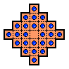 A resource count which is useful computationally is the one shown below. Unlike most 4-move resource counts, the one below is still valid even with diagonal moves. For the central game in the English or French boards, this resource count starts at 8 and finishes at 0. On the English game, the first and last jumps lose 4, leaving only 4 to be lost by the rest of the solution. On the French board, the solution above stays at 8 until the very last move, which loses all 8!