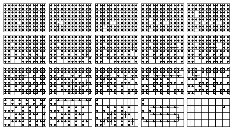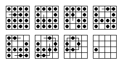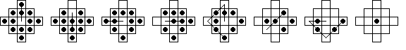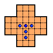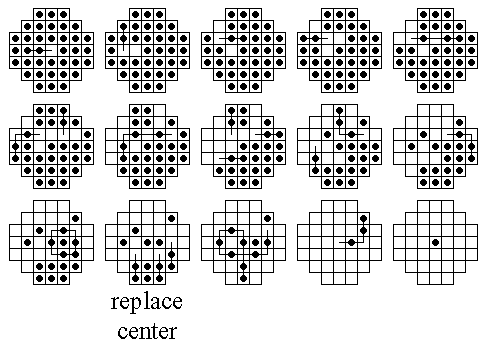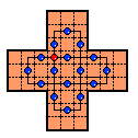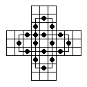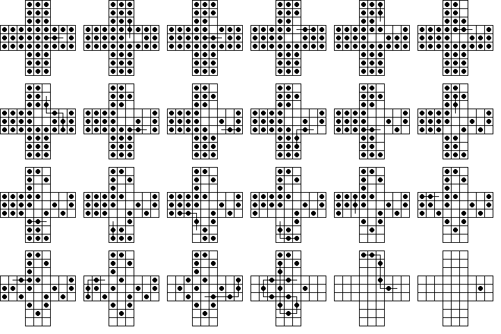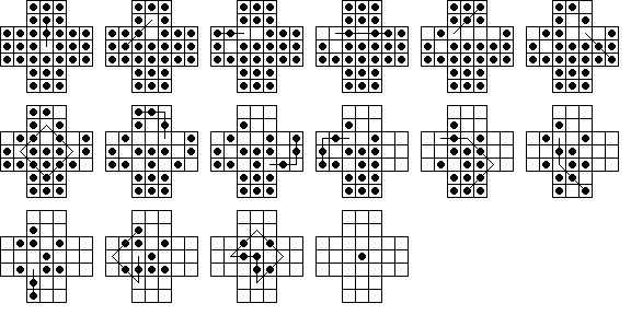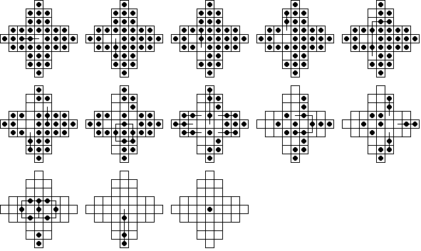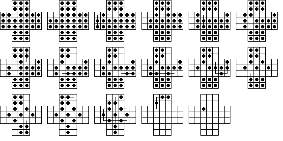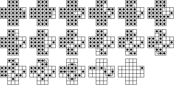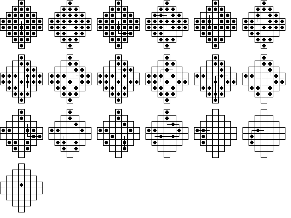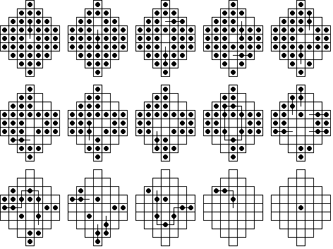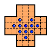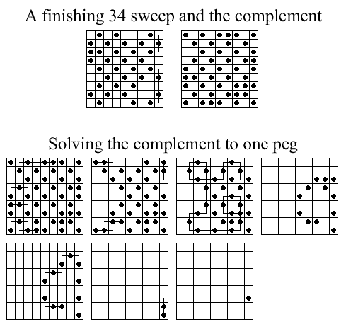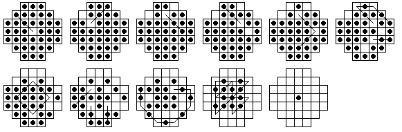 This board does have one unusual property: it is possible for any peg on the board to reach some corner. No matter where the final peg is to be left, it is possible to arrange things so that the last four moves start from the four corners. If this board is easy for you try finding solutions with this property. Click here to see an elegant 15-move solution with this property, due to John Harris [W1]. Here is another one I found. It is not always possible to have a minimal length solution with this corner finish property.