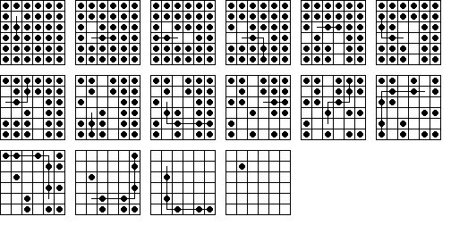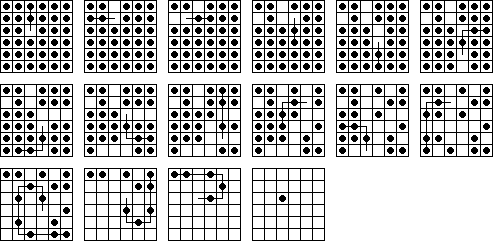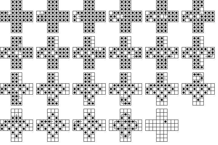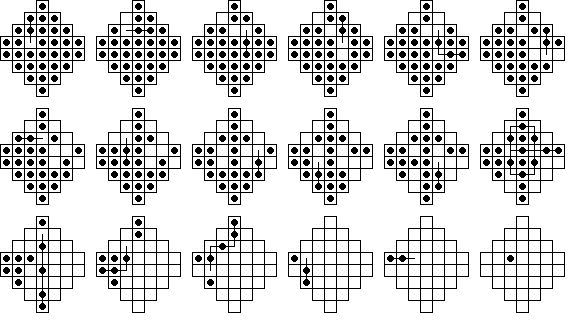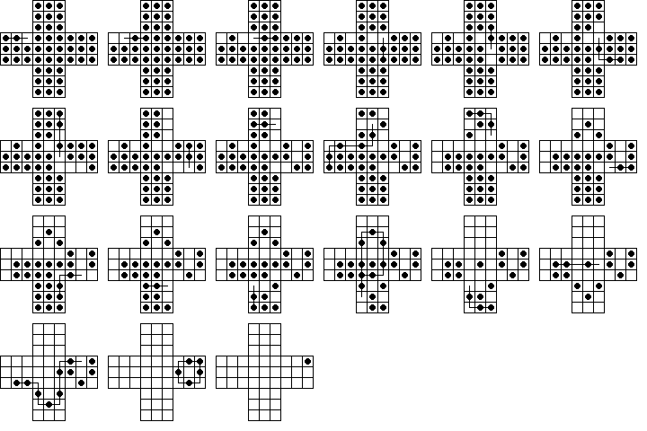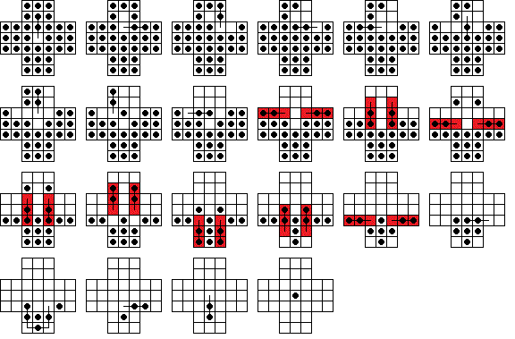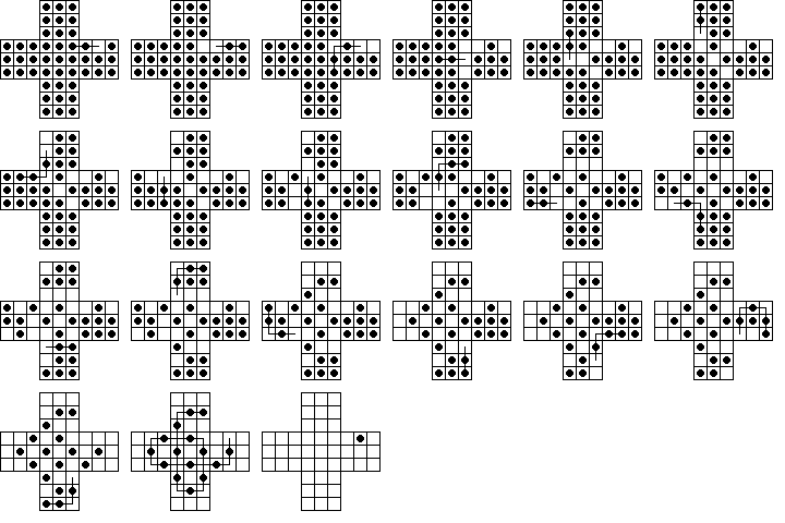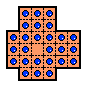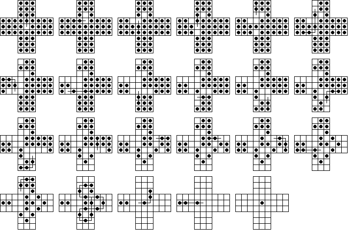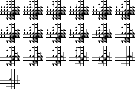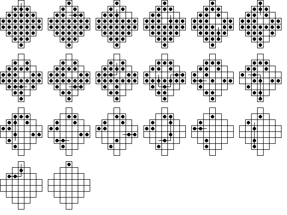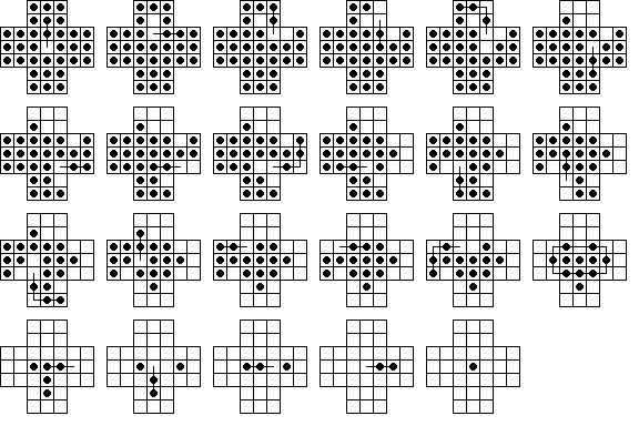 W9. | Durango Bill has a page on peg solitaire where he also calculates the number 23,475,688. This is the total number of board positions reachable from the central vacancy on the standard 33-hole board (not including positions equivalent by symmetry). He also calculates the total number of solutions to the central game. | |