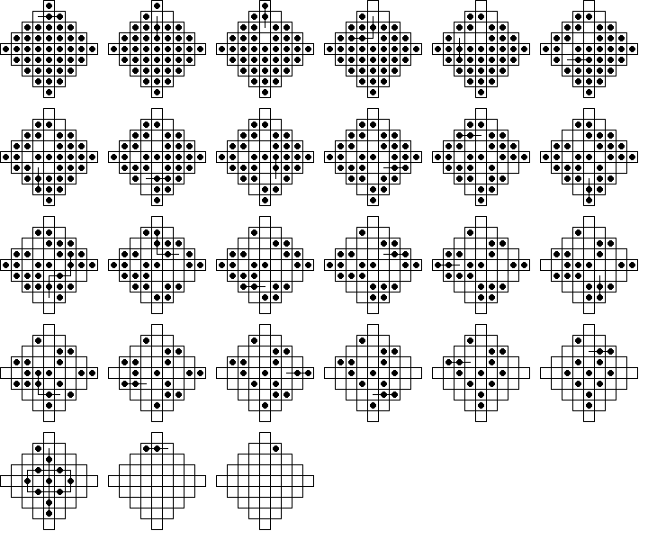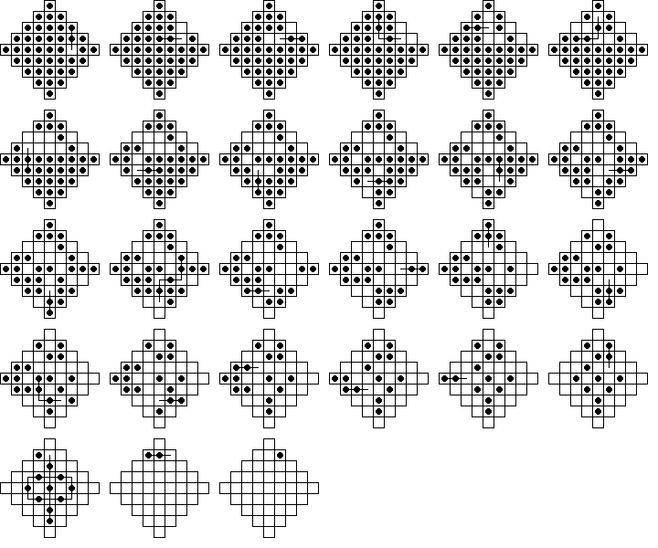 The table below shows a list of boards, together with some statistics about each. If you click on a board, you will see another table listing all single vacancy to single survivor problems solvable on that board, together with information about these solutions. These boards are square-symmetric (except for Diamond32) and we only list unique single vacancy to single survivor problems. In other words, if one problem can be obtained from another by rotation and/or reflection, only one will be listed. If you keep clicking on the tables, you can view diagrams of minimal length solutions.