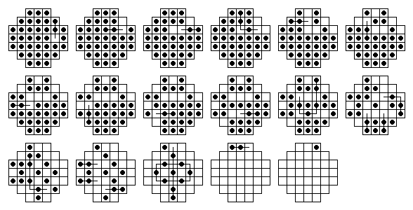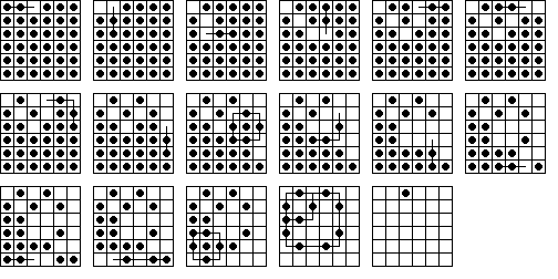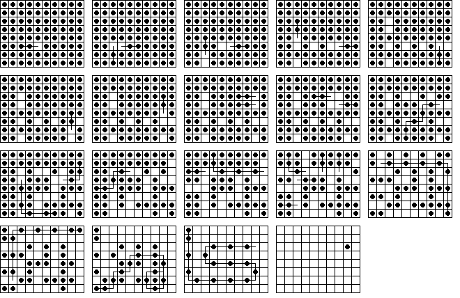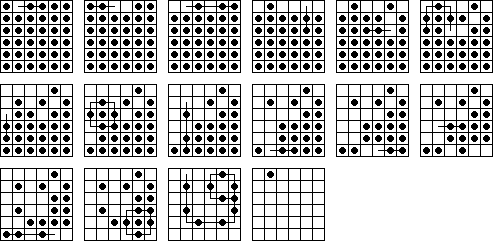 W7. | Sidney Cadot published an article (in Dutch) in the January 1998 issue of Machazine. In this article he describes how he was able to calculate all 18-move solutions to the central game on the 33-hole board. He determined that there are exactly 936 18-move solutions. | |