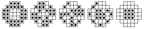 The reader may enjoy demonstrating that the central game on 3x3 toroidal solitaire is solvable. In fact, it is difficult to lose this game, is there any dead end? An analysis of n by m rectangular boards under toroidal jumping rules shows that if n and m are both multiples of 3 the board is still null-class and the "rule of three" still applies. If both n and m are not multiples of 3, the board is probably universal. A simple extension of the rule of three can give us this, because by wrapping around the board any pair of holes can be considered to have coordinates a multiple of 3 apart, as long as n and m are not multiples of 3. If one of n and m is a multiple of 3 and the other is not, then we have an intermediate case where the rule of three applies in only one dimension (the one divisible by 3). My program has found that the shortest solution to the complement problem on the 5x5 toroidal board has 8 moves, and on the 6x6 toroidal board, 11 moves.
