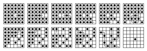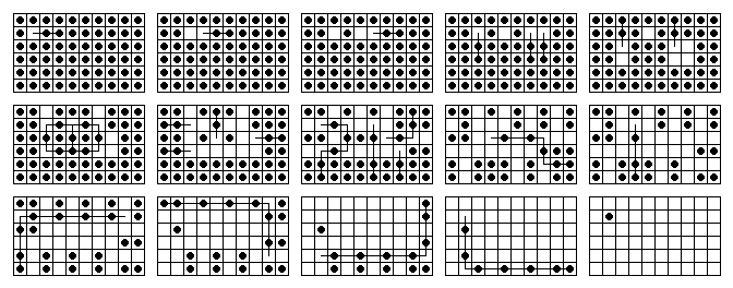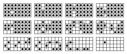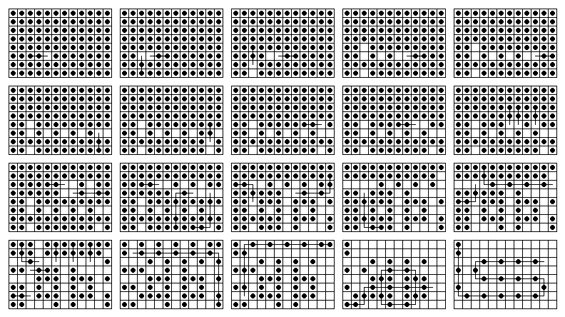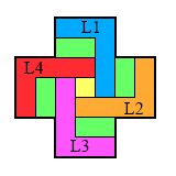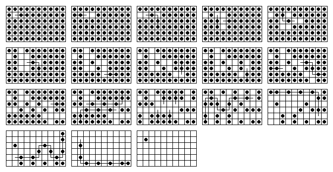 Nonetheless, there are ten single vacancy to single survivor problems solvable on this board, and each can be solved in 20 or 21 moves. If you are solving a problem by hand, the best technique to use (on any board) is to decompose it into block removals. Note that the French board decomposes nicely into L and 3-removals as shown on the right. In order to solve a particular problem, one can modify this diagram with appropriate starting and ending moves, as shown on the left.