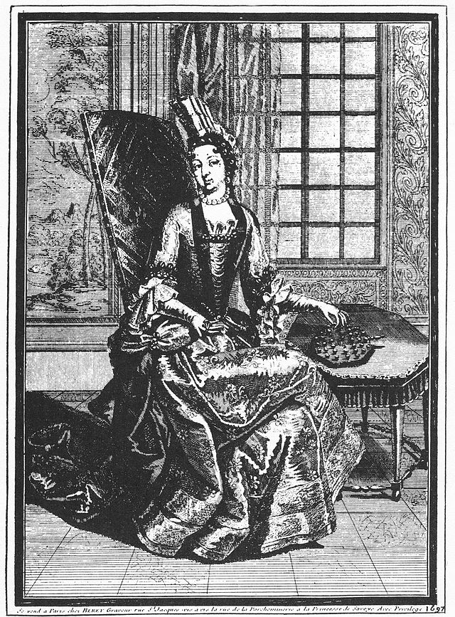 A 1697 engraving by C-A Berey of the Princess Soubise beside a French solitaire board. |