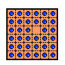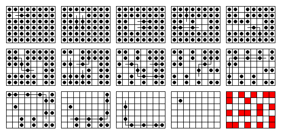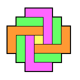 Consider, for example, the 4x4 board. Under normal peg solitaire rules, this board isn't very interesting, the only SVSS problems which are solvable have the form: vacate a2, finish at a3 (or d3). Under toroidal jumping rules, the board becomes universal. The symmetry of the board is also very different: there are no corners or edges—all holes are the same. The red graphic to the left shows a curious 8-loop on the 4x4 toroidal board. Unfortunately, it cannot be reached from any single vacancy start. My program has found that all SVSS problems on this board can be solved in a minimum of 5 moves (see the example solution to the left). It is remarkable that the first move can be a double jump!