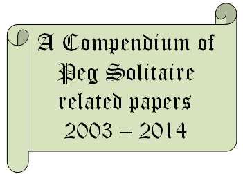 B6. | George I. Bell, A Compendium of Peg Solitaire related papers, 2014 (175 pages, 90 pages double sided). This is a compilation of 13 papers relating to peg solitaire (2003-2014). You can download all the papers separately, but this makes a nice, color-coded, bound volume. To see the list of papers, download the Table of Contents. Please email me if you would like a zip file containing all 13 papers (2.6 MB). |