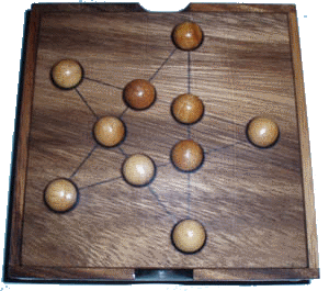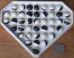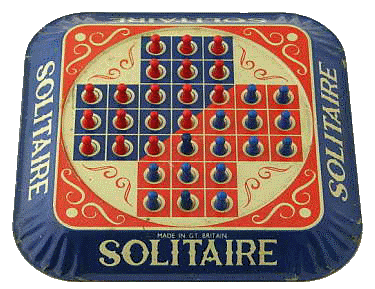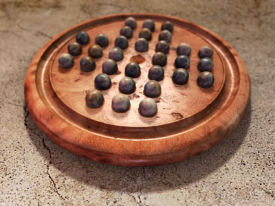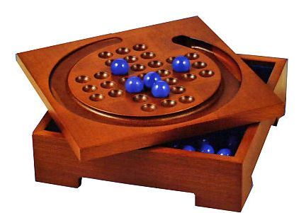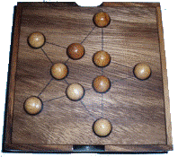It seems everyone (at least in my generation) has run into this puzzle at some point. Boards range from drilled planks using golf tees, to beautifully crafted hardwood boards with indentations for marbles, including a nice rim around the edge for storage of marbles as they are removed. Computer versions of the game are also common (see my Javascript games below).