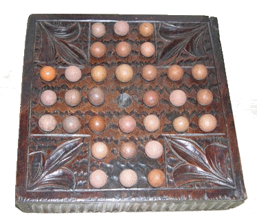 A hand carved board with clay marbles, dating from the early 1900's (photo courtesy St. John Stimson). |