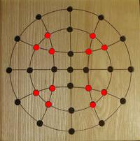 Over the years, there have been various attempts to describe a solution to the central game that is easy to remember. Bergholt's 18-move solution is shortest, but tends to be difficult to recall. Nonetheless, a specialized "Wolstenholme notation" has been invented to assist in recalling it [W19]. Another solution, called "Jabberwockey", is given in Martin Gardner's book [B2]. This solution has some nice symmetry properties, which make it easier to remember, as well as faster because one captures pegs with both hands simultaneously during the solution. Click here to see a diagram of this solution (paired moves are shown in red).